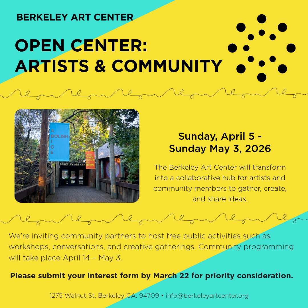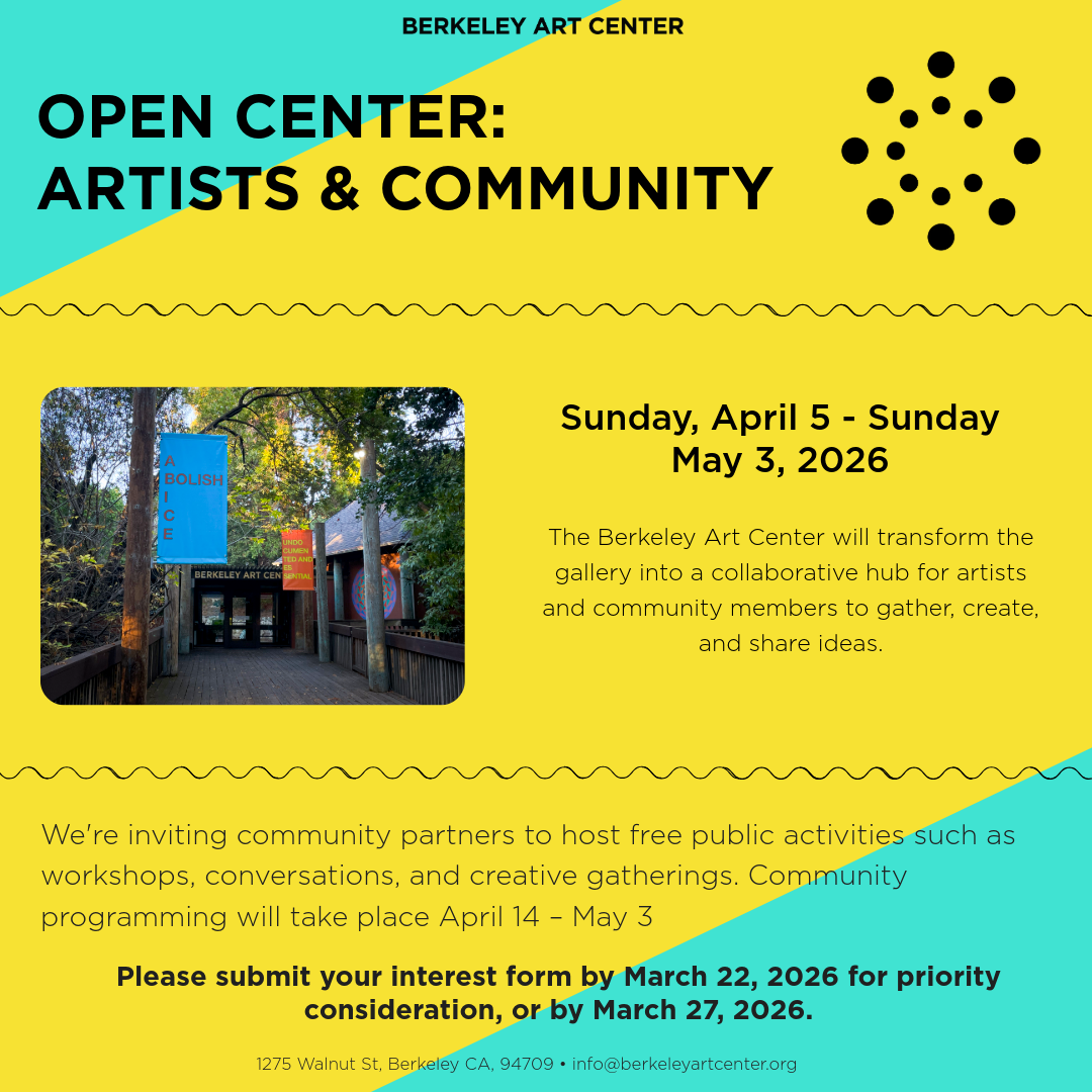 *Please note: We will respond to folks by April. Given our limited capacity, we may not be able to accommodate everyone's requests. We appreciate your patience and understanding! Any questions, contact Gisela Insuaste at info@berkeleyartcenter.org.
